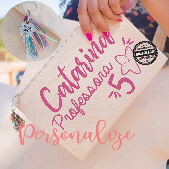 Bolsa em algodão " Professora 5 estrelas " Texto personalizado ao seu gosto, com pendente colorido e trevo gravado com nome e ano.