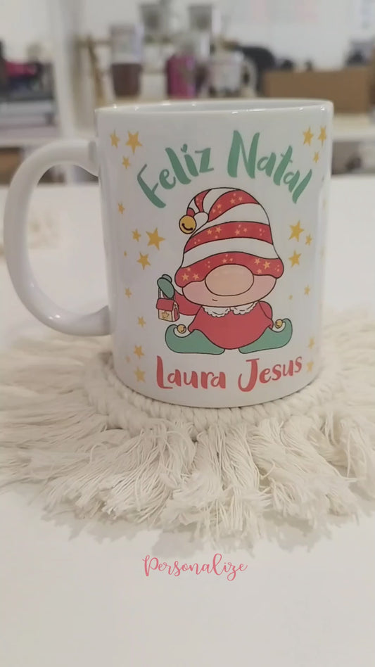 Caneca Gnoma "Feliz Natal" com opção caixinha asa coração
