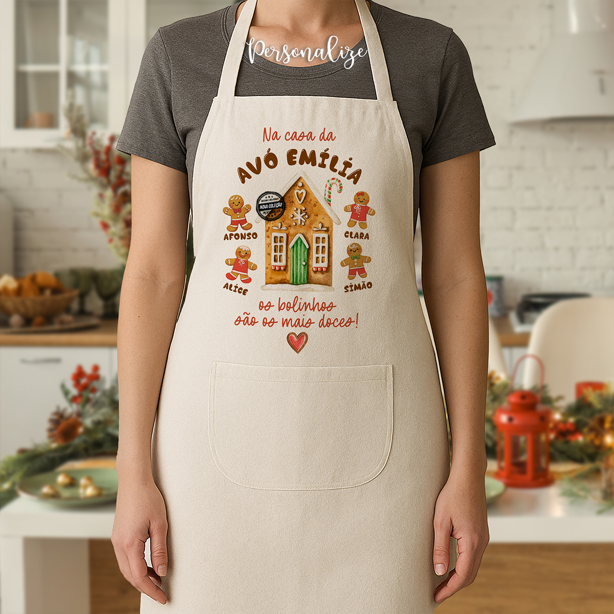 Avental de Natal "Na casa da avó os bolinhos são os mais doces", com um design amoroso de casa e bolachas de gengibre.