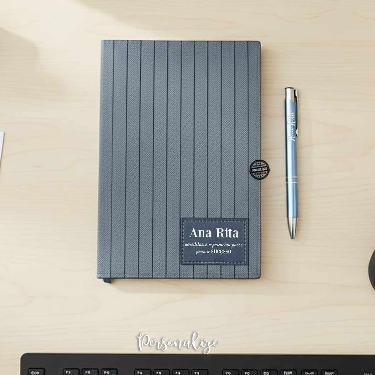 Transforme o ato de escrever em um gesto de estilo e sofisticação com este conjunto exclusivo. O bloco A5 azul , capa rígida em PU (pele sintética) com páginas de alta qualidade, vem acompanhado de uma caneta elegante de escrita suave, ambos personalizados com nome e pequena frase de inspiração. Bloco embalado numa sleeve de cartão de cor preta