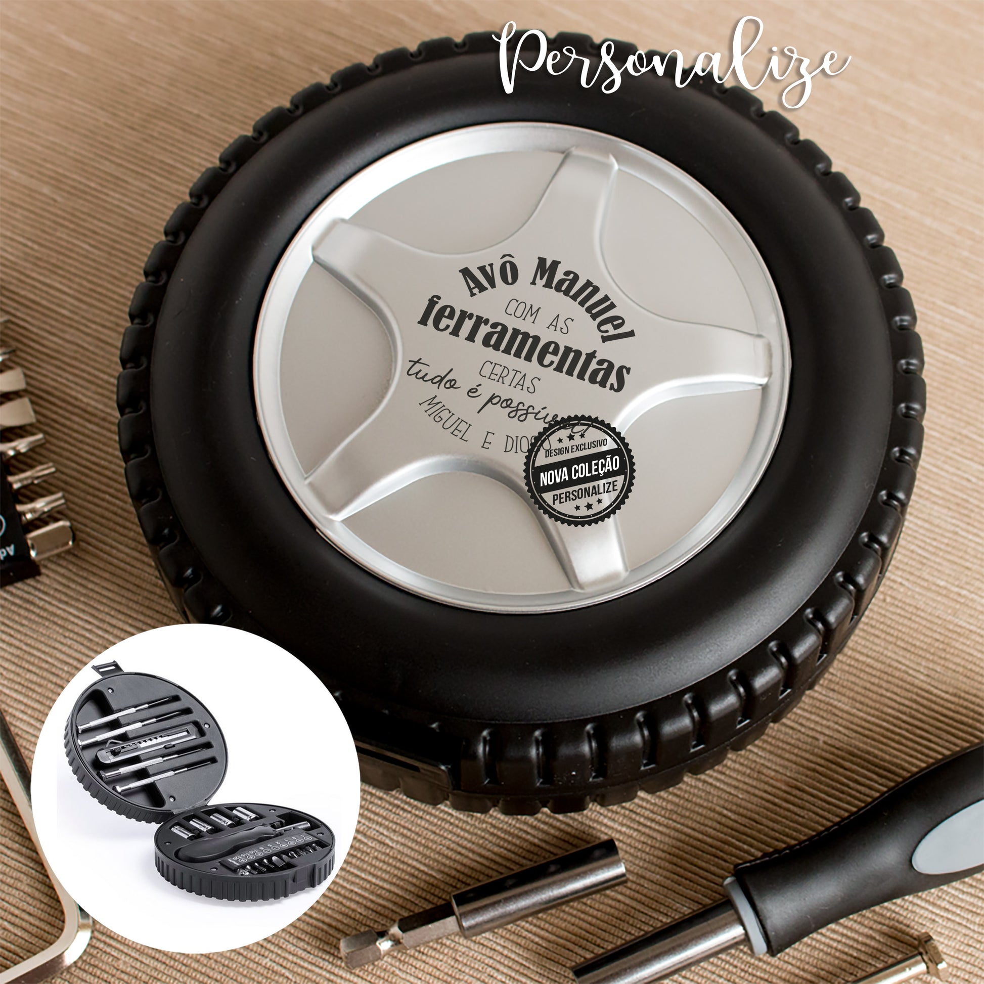 Conjunto de ferramentas em forma de Pneu de 20 acessórios em estojo resistente.