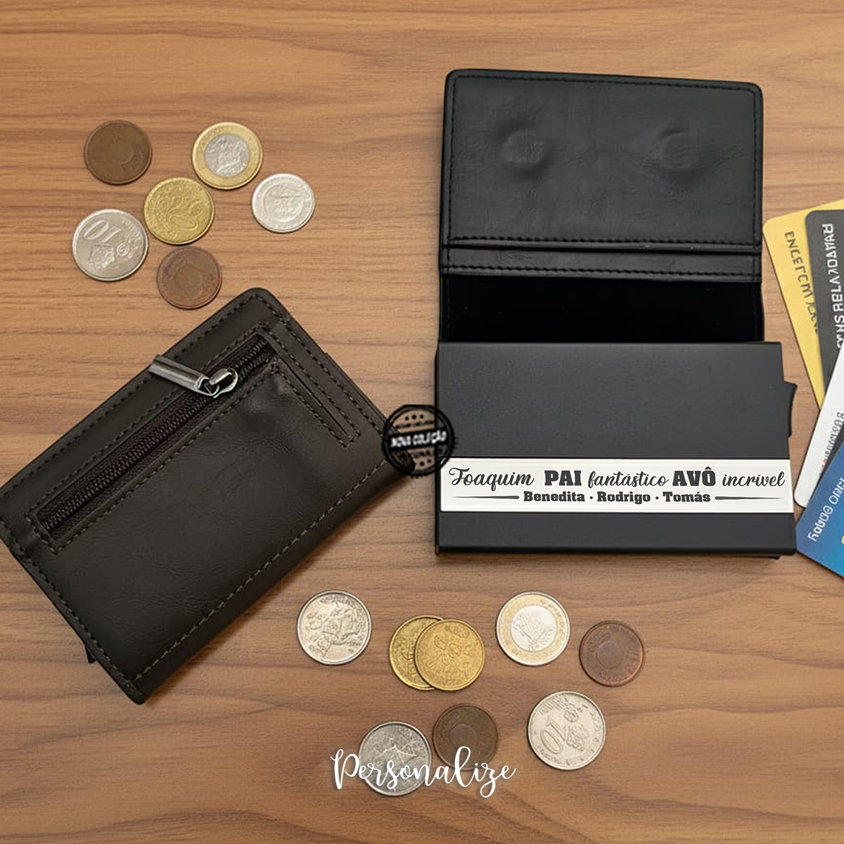 No interior, conta ainda com compartimentos para notas, dois compartimentos adicionais e uma bolsa para moedas. Personalize com pequena frase que desejar.