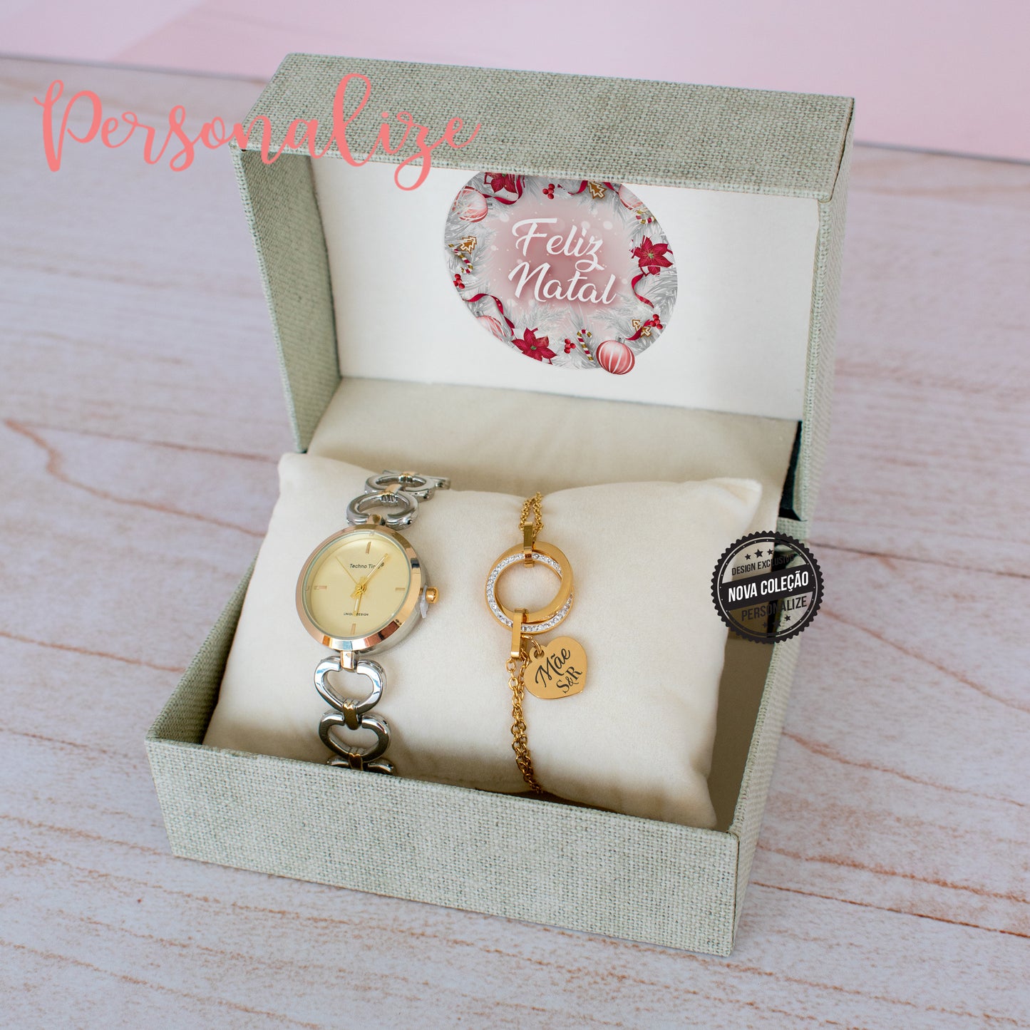 Conjunto relógio e pulseira " feliz Natal Mãe" relógio com bracelete em corações em aço inoxidável e pulseira com elos em aço e zircónias com coração personalizável.