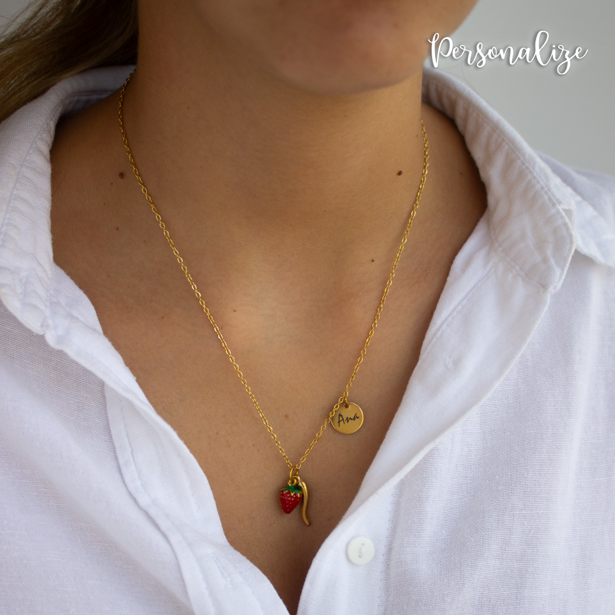 Fio em aço inox dourado com pendente super fofo de morango e chifre, um símbolo de proteção, força e poder, podendo ser usado para afastar o mau olhado ou atrair boa sorte. , perfeito para quem adora acessórios com personalidade.
