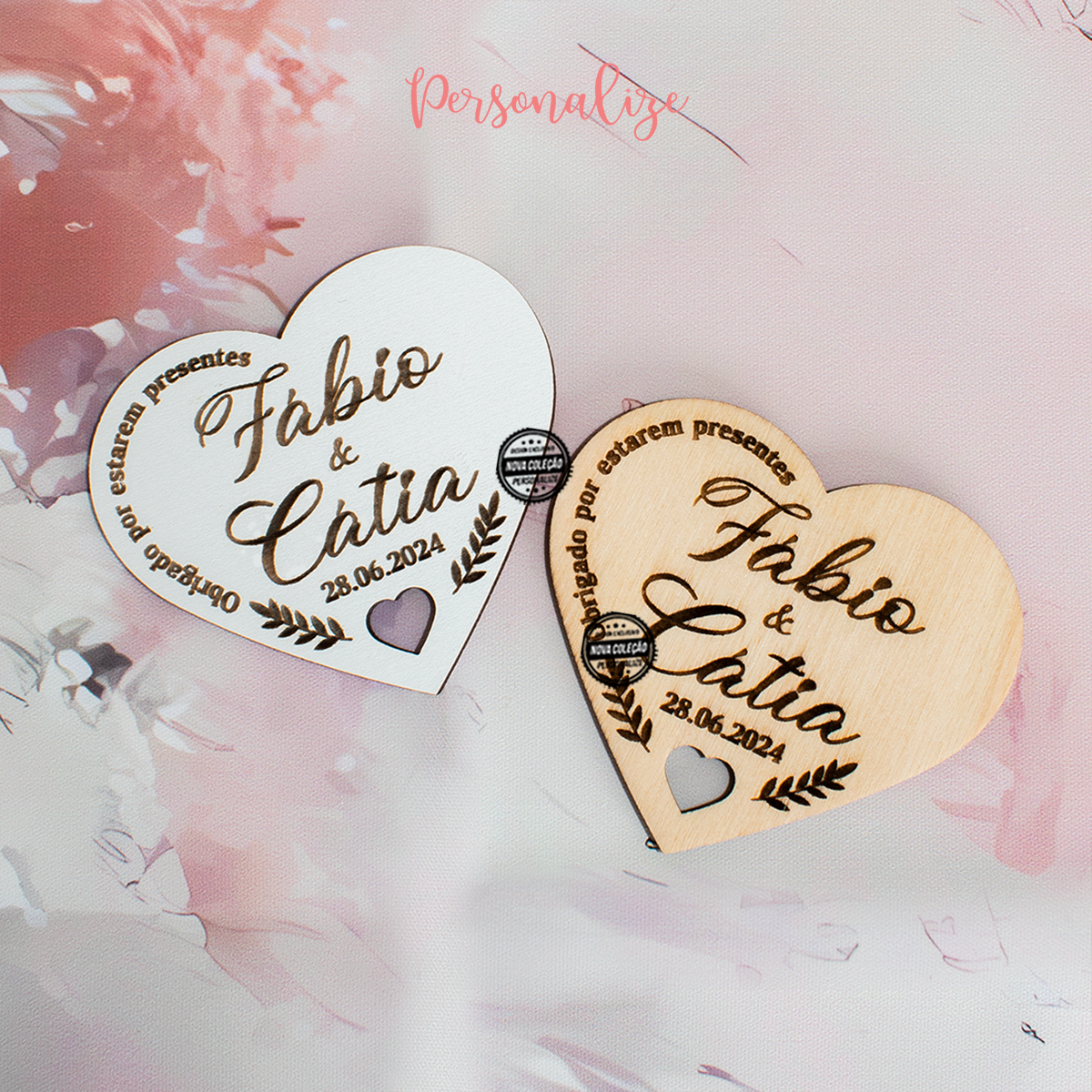 Surpreenda os seus convidados com uma lembrança cheia de significado e delicadeza! Os nossos ímans em formato de coração, feitos de madeira natural e personalizados com gravação a laser, são o detalhe perfeito para eternizar o vosso dia especial.