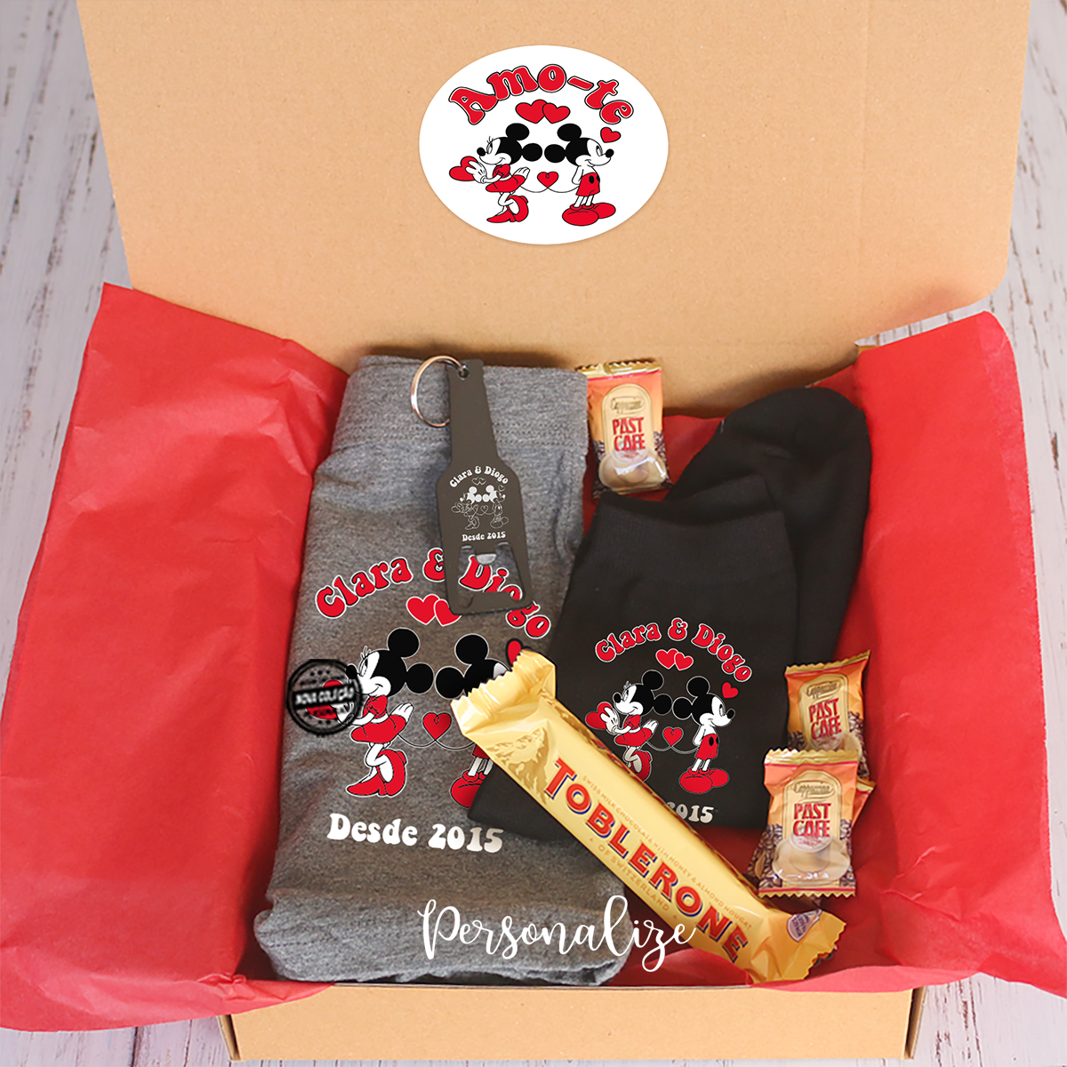 Kit namorados "Minnie e Mickey", personalize com nome e data.