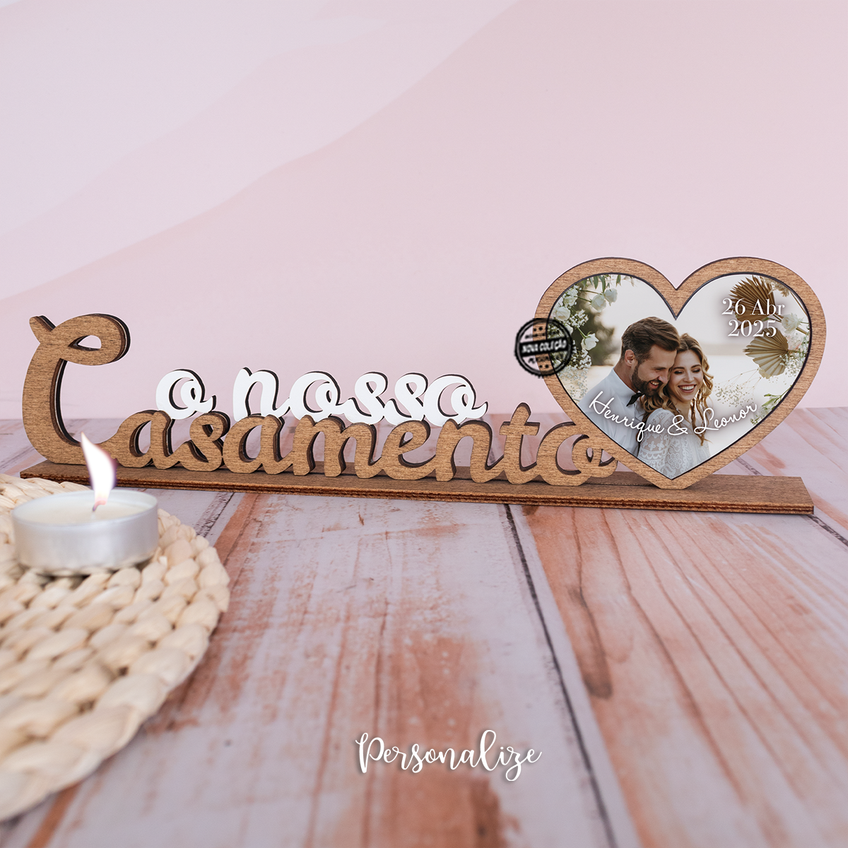 A nossa moldura recortada em madeira com a frase “O nosso casamento” é o detalhe perfeito para celebrar um dos dias mais importantes da vida.
