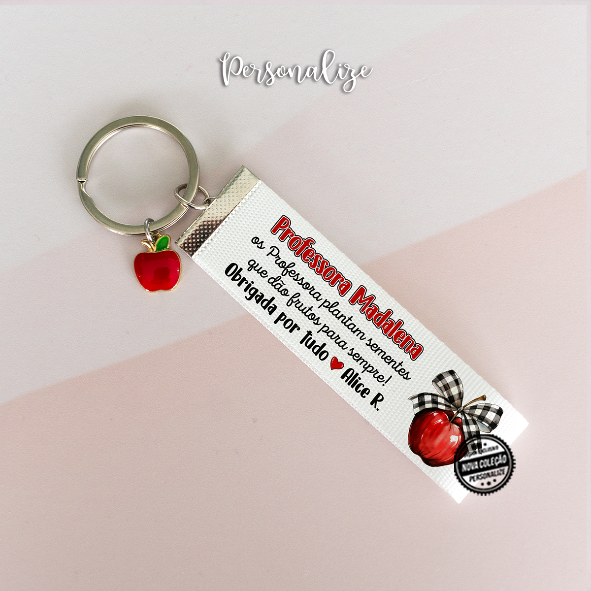 As nossas peças com um design exclusivo de maçã e laço são perfeitas para transmitir gratidão e reconhecimento pelo empenho e dedicação ao longo do ano. Personalize com a frase que desejar.