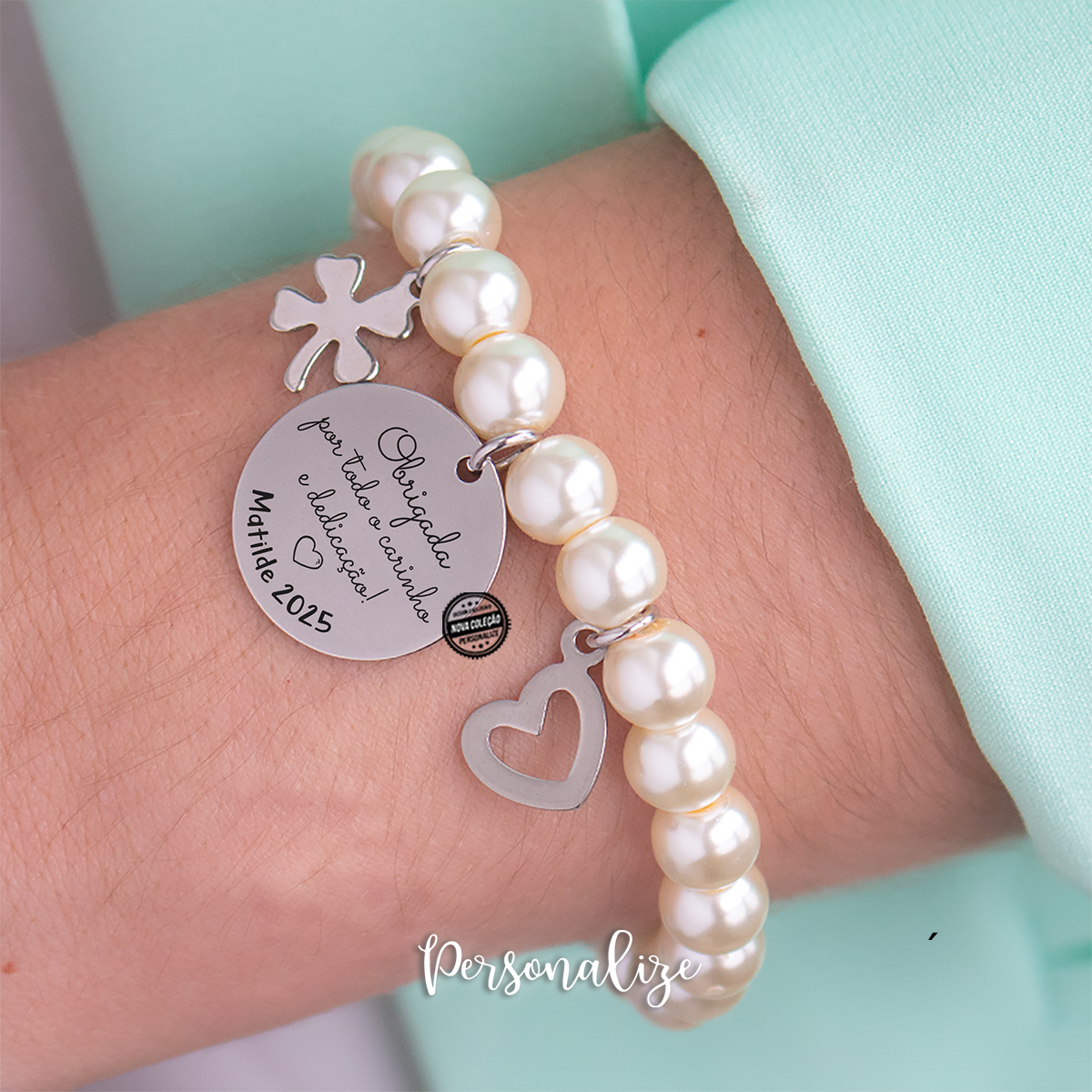 Pulseira em pérolas sintéticas com elástico e medalha em aço inóx personalizada. Um presente super giro e económico que vai surpreender que recebe.