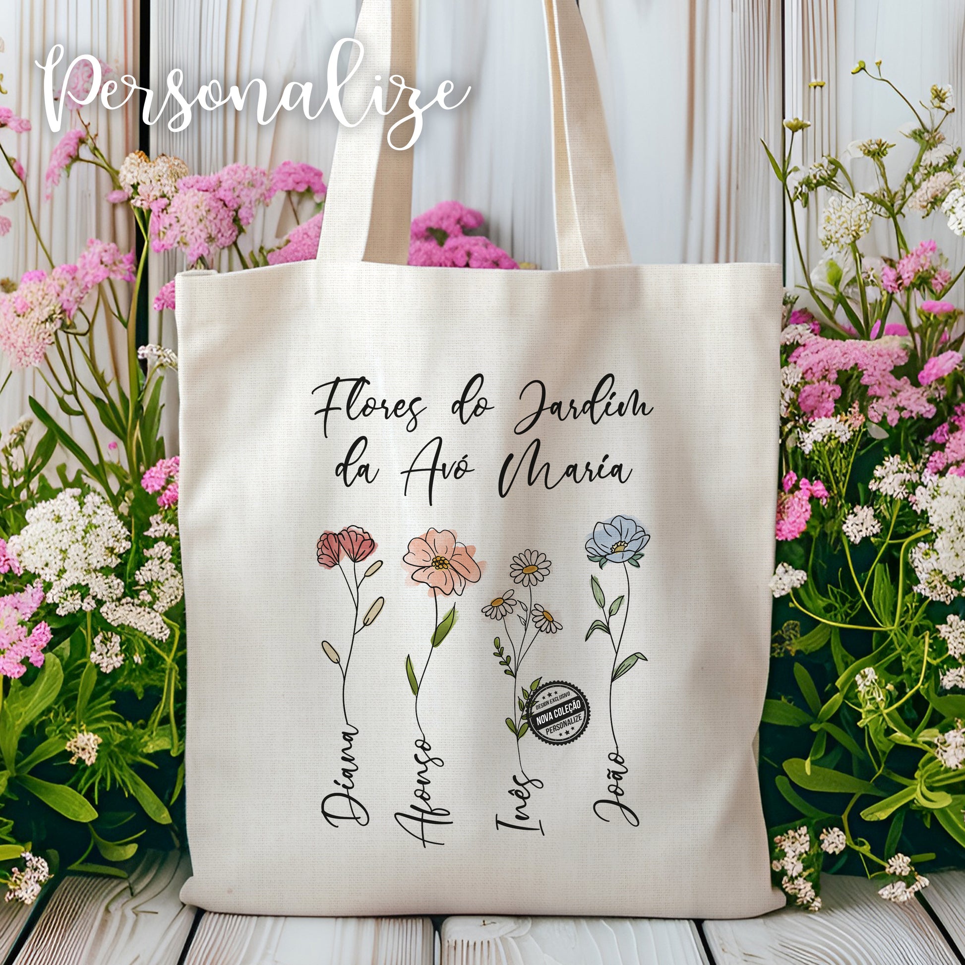 Surpreenda a sua avó com uma tote bag única, com frase personalizada e um lindo design floral com os nomes dos netos nas flores 🌼🌺