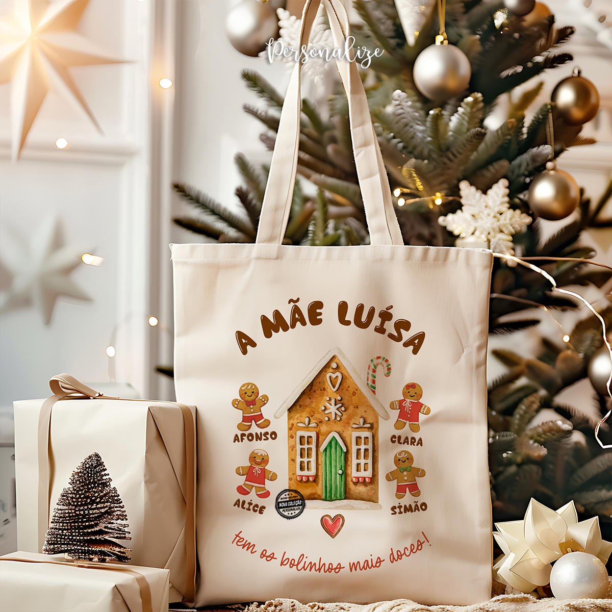 Saco de Natal "Na casa da mamã os bolinhos são os mais doces", com um design amoroso de casa e bolachas de gengibre.